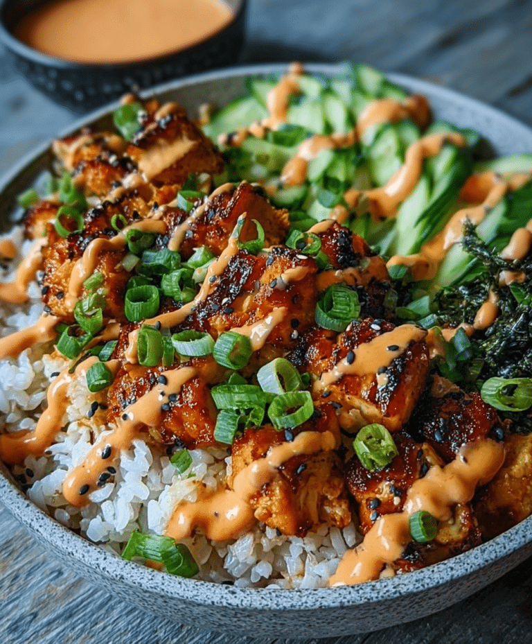 Bang Bang Chicken Bowl is a versatile, flavorful, and colorful meal perfect for quick weeknight dinners, meal prep, or family gatherings. With tender chicken, crisp vegetables, and a creamy, sweet-and-spicy sauce, this dish delivers bold flavors and balanced nutrition in every bite. Garnished with sesame seeds and green onions, it’s visually appealing and satisfying. Try this Bang Bang Chicken Bowl for a weeknight dinner that’s easy, protein-packed, and irresistibly tasty—your family and guests will love it!
