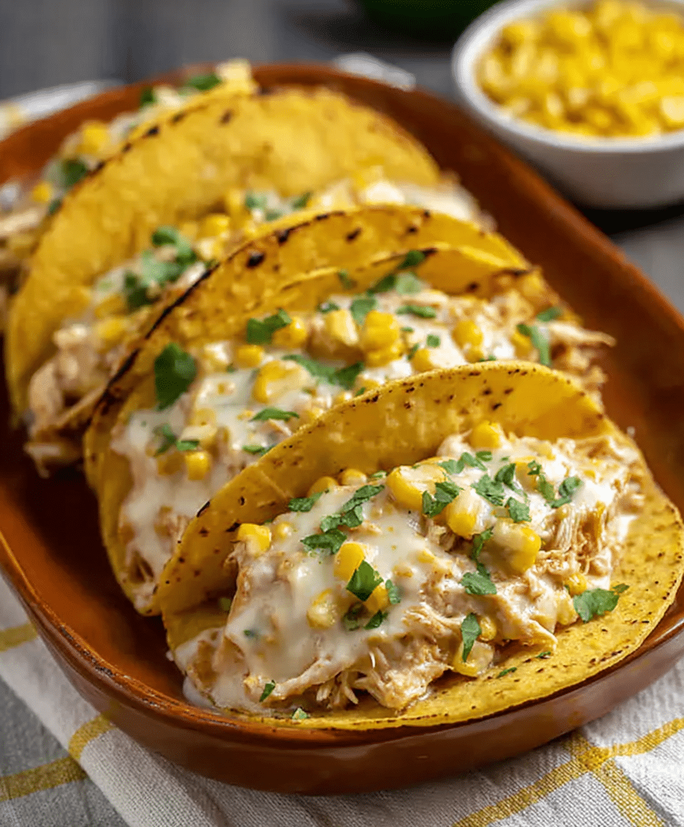Perfect for weeknight dinners, casual entertaining, or even meal prep, these tacos stand out because they strike a balance between ease and flavor. The creamy sauce wraps around tender chicken and sweet corn, while the tortillas bake up slightly crisp on the edges with gooey melted cheese inside. It’s the kind of recipe that quickly becomes part of your regular rotation because it’s reliable, delicious, and always satisfying.