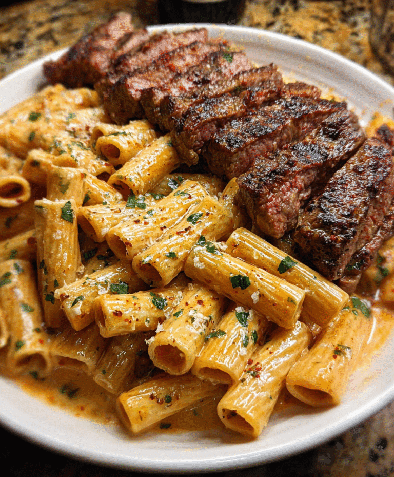 - Toss cooked rigatoni in sauce, return seared steak, stir gently.