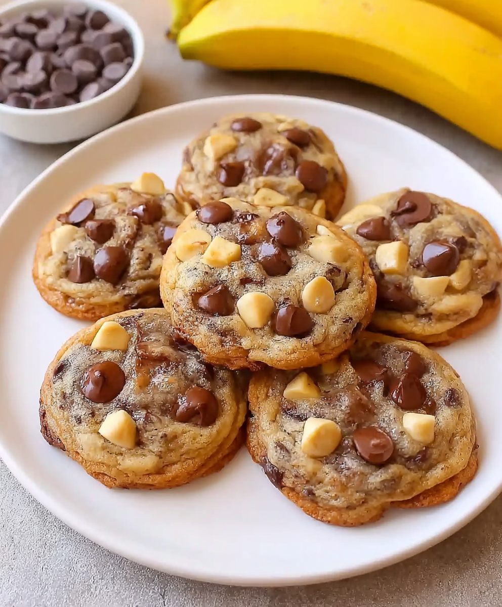 Soft, chewy cookies combining the cozy flavors of banana bread with chocolate chip cookies. Perfect for using ripe bananas and a comforting treat for snack or dessert.