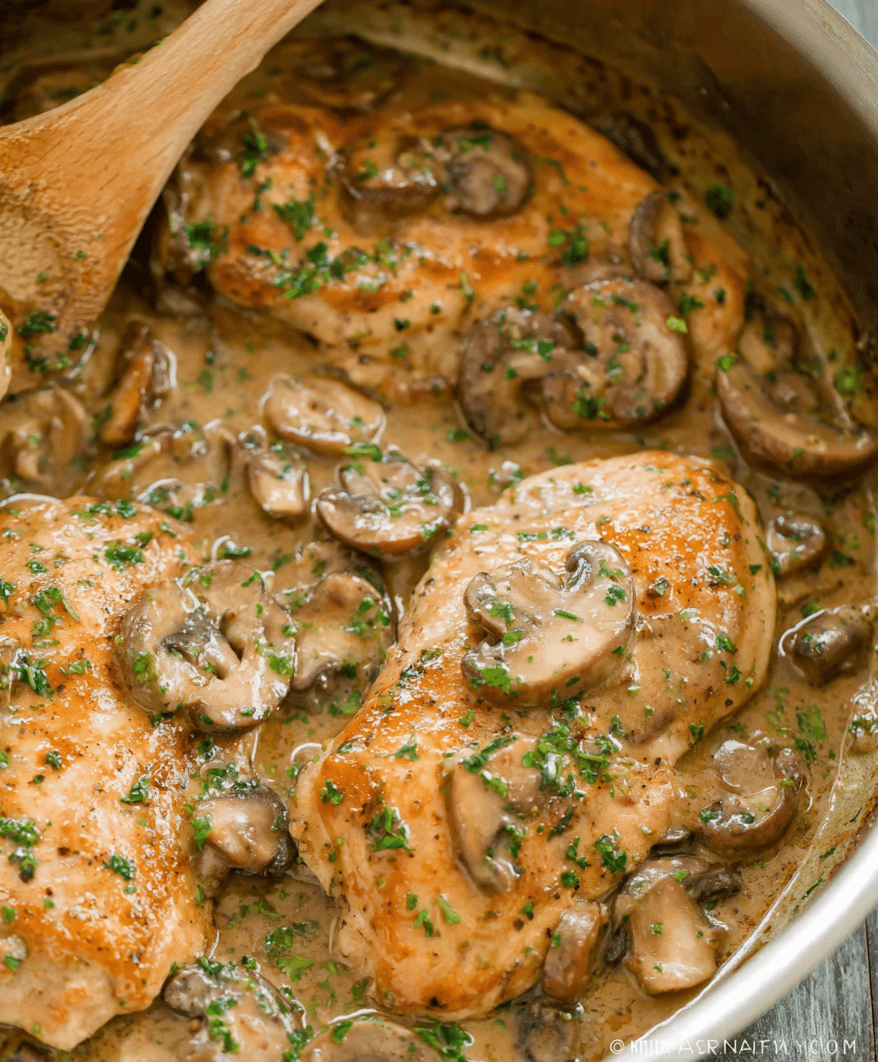 Return the chicken to the pan, spooning some of the sauce and mushrooms over the top. Sprinkle the chicken with chopped parsley for a fresh flavor kick. Allow the chicken to warm through for about 2 minutes, making sure the sauce thickens to your desired consistency. The sauce will continue to thicken as it cools, so be mindful of how much you reduce it.