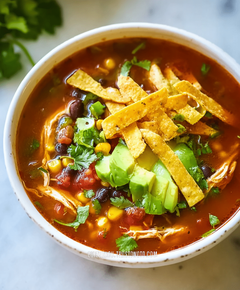 Chicken Tortilla Soup is a bold, cozy Mexican-inspired soup made with shredded chicken, beans, corn, and warm spices in a tomato-lime broth. Topped with crispy tortilla strips and fresh garnishes, it’s flavorful, comforting, and easy to prepare.