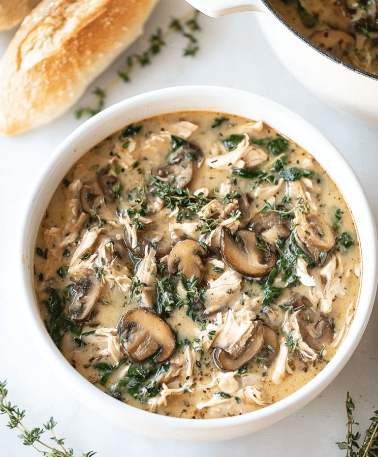 This Comforting Rotisserie Chicken and Mushroom Soup is rich, creamy, and deeply satisfying. Made with tender rotisserie chicken, earthy mushrooms, fresh herbs, and spinach, it’s a cozy one-pot soup that comes together quickly and delivers big comfort in every spoonful.