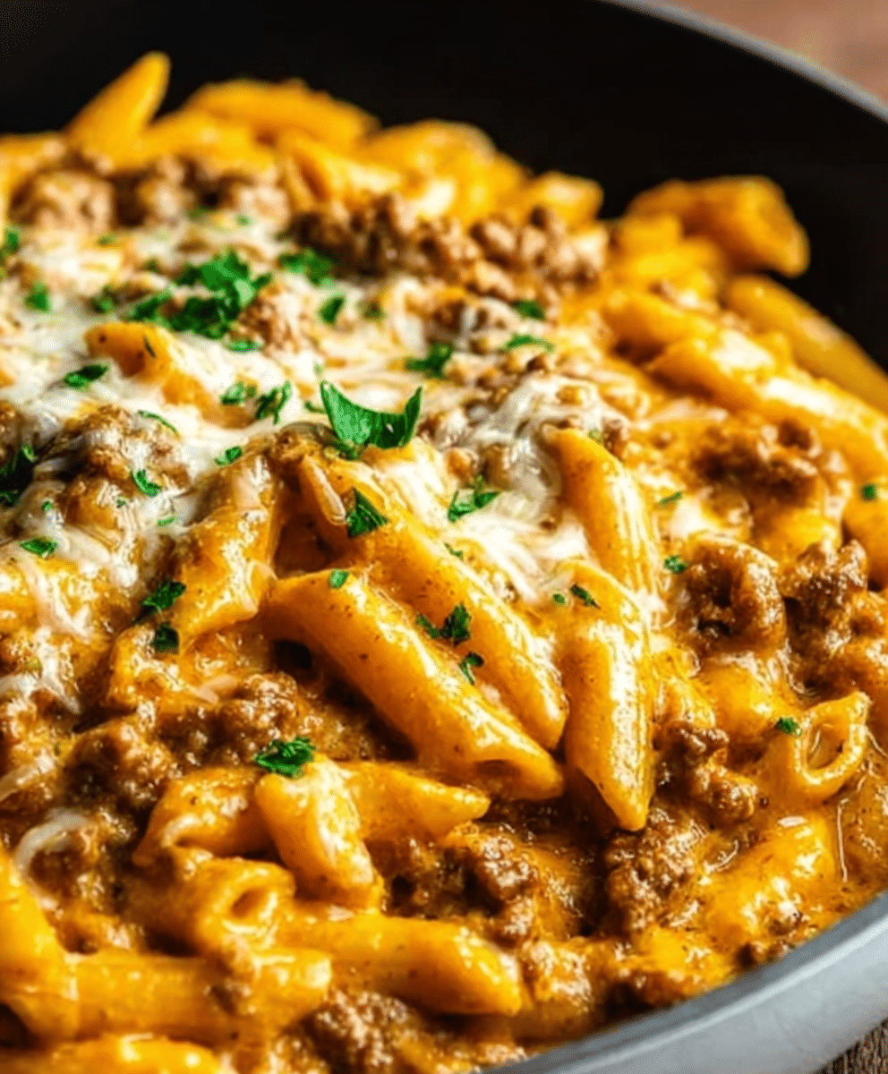 It’s ideal for busy weeknights, family dinners, or meal prep, delivering a satisfying balance of cheesy, hearty, and healthy elements. Each bite offers a comforting mix of textures: tender pasta, juicy ground beef, and a luscious sauce that coats every noodle perfectly.