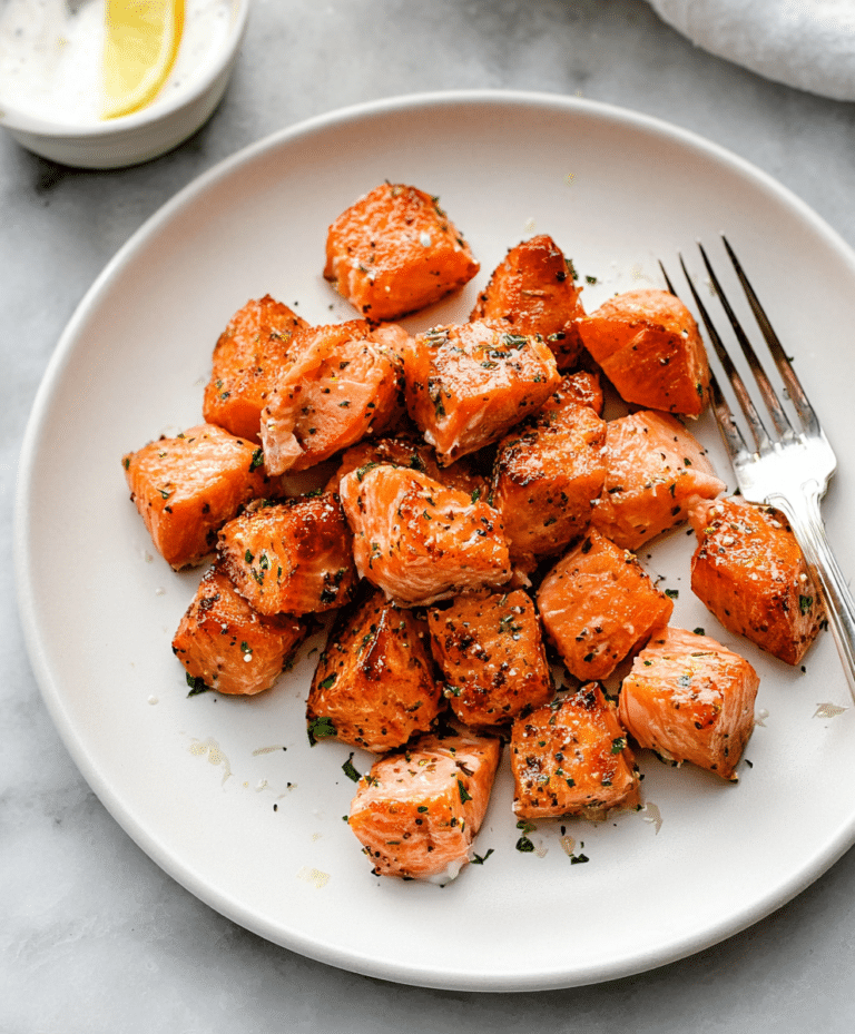 Air fryer salmon bites with lemon garlic butter are the ultimate quick and flavorful seafood recipe that’s perfect for busy weeknights. These air fryer salmon bites are tender, juicy, and coated in a rich lemon garlic butter sauce that adds brightness and depth to every bite. Ready in just 20 minutes, this easy air fryer salmon bites recipe is ideal for healthy dinners, meal prep, or light lunches. The salmon cooks quickly at high heat, creating a delicate texture while soaking up the buttery, garlicky sauce. Whether you’re adding them to bowls, salads, or serving them on their own, these lemon garlic salmon bites deliver a fresh, satisfying, and protein-packed meal.