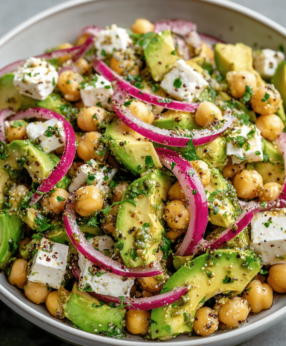 A fresh, quick, and vibrant salad featuring chickpeas, avocado, feta, and herbs, perfect for a Mediterranean-inspired lunch or side dish.