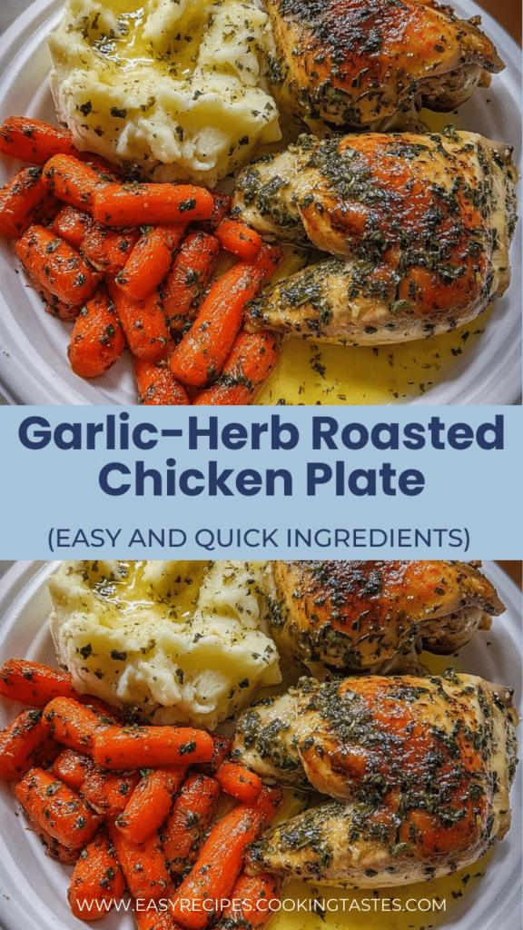 Garlic-Herb Roasted Chicken Plate is a comforting dinner with juicy roasted chicken, creamy mashed potatoes, and buttery glazed baby carrots. Perfect for a cozy weeknight or Sunday meal.