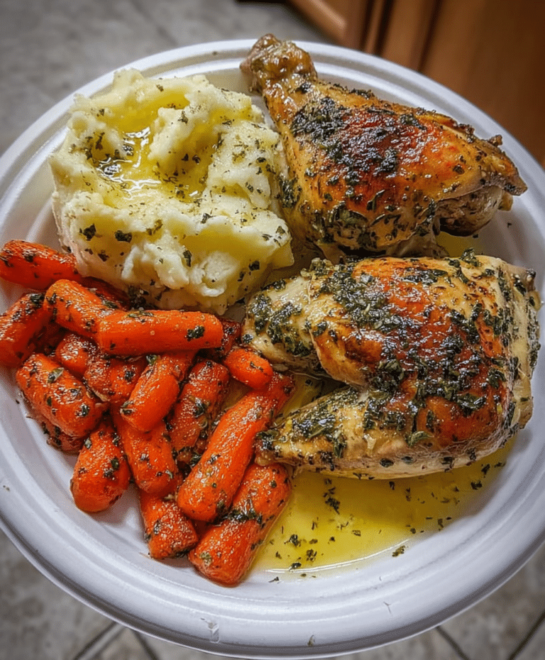 This Garlic-Herb Roasted Chicken Plate is the ultimate comfort food dinner that brings big Sunday vibes straight to your table. Juicy chicken leg quarters roasted to golden perfection are paired with creamy mashed potatoes and buttery glazed baby carrots, creating a harmonious plate of textures and flavors. Perfect for busy weeknights or a cozy weekend meal, this recipe combines the aromatic richness of garlic, Italian herbs, and paprika with the soothing creaminess of mashed potatoes and the sweet, tender crunch of glazed carrots. Home cooks will love how easy it is to assemble, and families will rave over its comforting, hearty flavor. This recipe is ideal for serving two, though it easily scales up for more, making it a versatile option for intimate dinners or casual gatherings. The golden, crispy chicken skin, soft buttery potatoes, and lightly seasoned carrots make every bite irresistible, while the simple ingredients keep it approachable for even beginner cooks.
