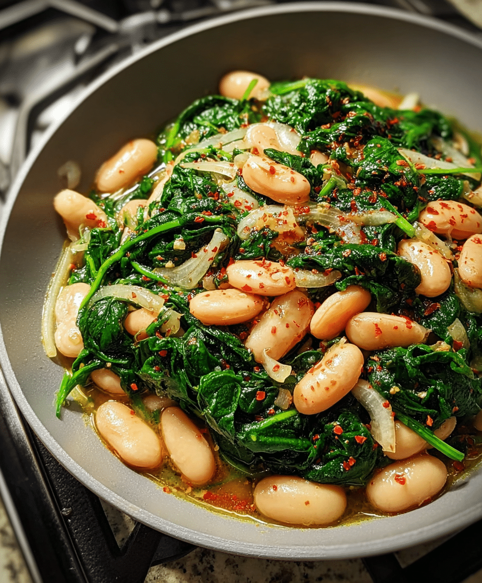 This Easy Spinach and White Beans recipe is a quick, creamy, and comforting vegetarian dish that’s perfect for a healthy weeknight dinner or a light lunch. Made with fresh chopped spinach, tender white beans, and a luscious creamy sauce, this one-pan recipe is packed with flavor, nutrients, and satisfying texture. The garlic-infused olive oil gives a fragrant start, while red pepper flakes add a gentle warmth (optional for spice lovers). A splash of vegetable broth and a touch of heavy cream—or coconut milk for a vegan option—creates a silky, flavorful sauce that ties everything together. Fresh lemon juice brightens the dish, and a sprinkle of chopped parsley adds a vibrant finish. Ideal for busy home cooks, this skillet meal comes together in just 25 minutes, making it a perfect choice for quick, healthy, and family-friendly dining.