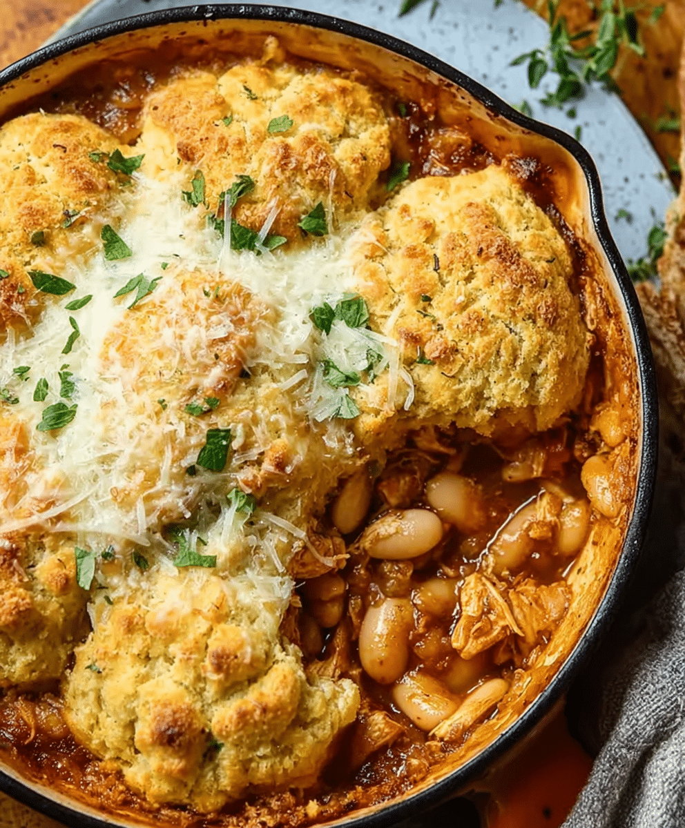 When the weather turns chilly or you crave a comforting, hearty dinner, this Italian Chicken Cobbler with Cannellini Beans & Parmesan Biscuits is the ultimate crowd-pleaser. Imagine tender, juicy chicken simmered in a rich, savory Italian-inspired stew, studded with cannellini beans, and topped with fluffy, golden Parmesan biscuits that soak up every bit of flavor. This one-dish meal is the perfect combination of cozy, rustic comfort and Italian flair, ideal for family dinners, casual entertaining, or simply indulging in a warm, satisfying meal.