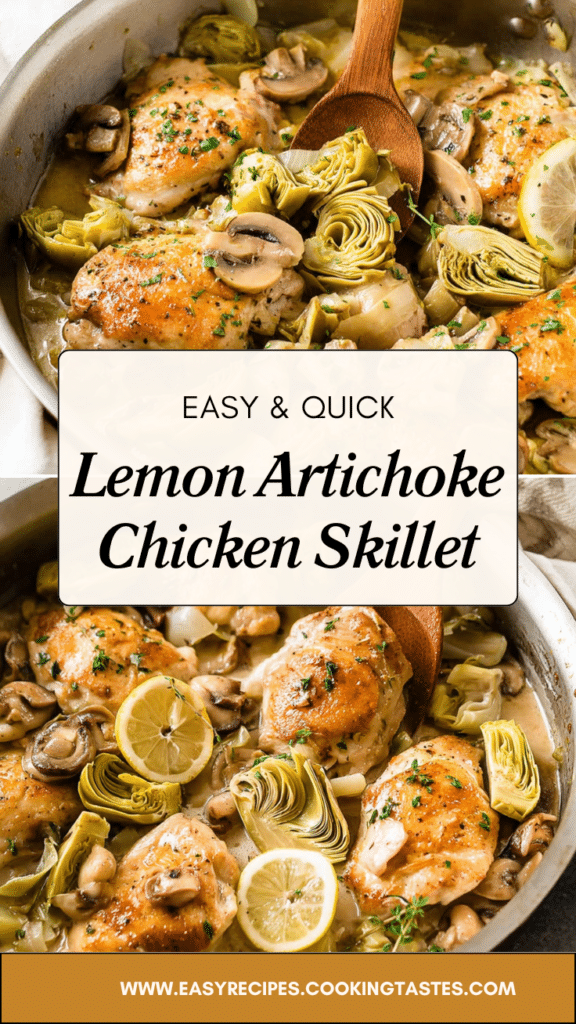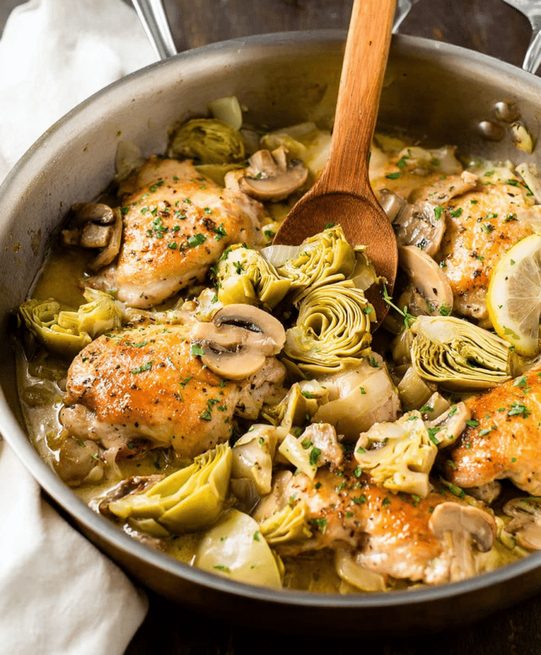 Lemon Artichoke Chicken is a simple yet elegant skillet dinner that’s bright, saucy, and satisfying. With tender chicken, earthy mushrooms, tangy artichokes, and a silky lemon-caper sauce, this recipe is perfect for weeknights or special meals alike. Easy to prepare, full of flavor, and visually appealing, it’s a dish your family will love. Serve hot with your favorite starch, garnish with parsley, and enjoy a restaurant-quality dinner at home in just 30 minutes.