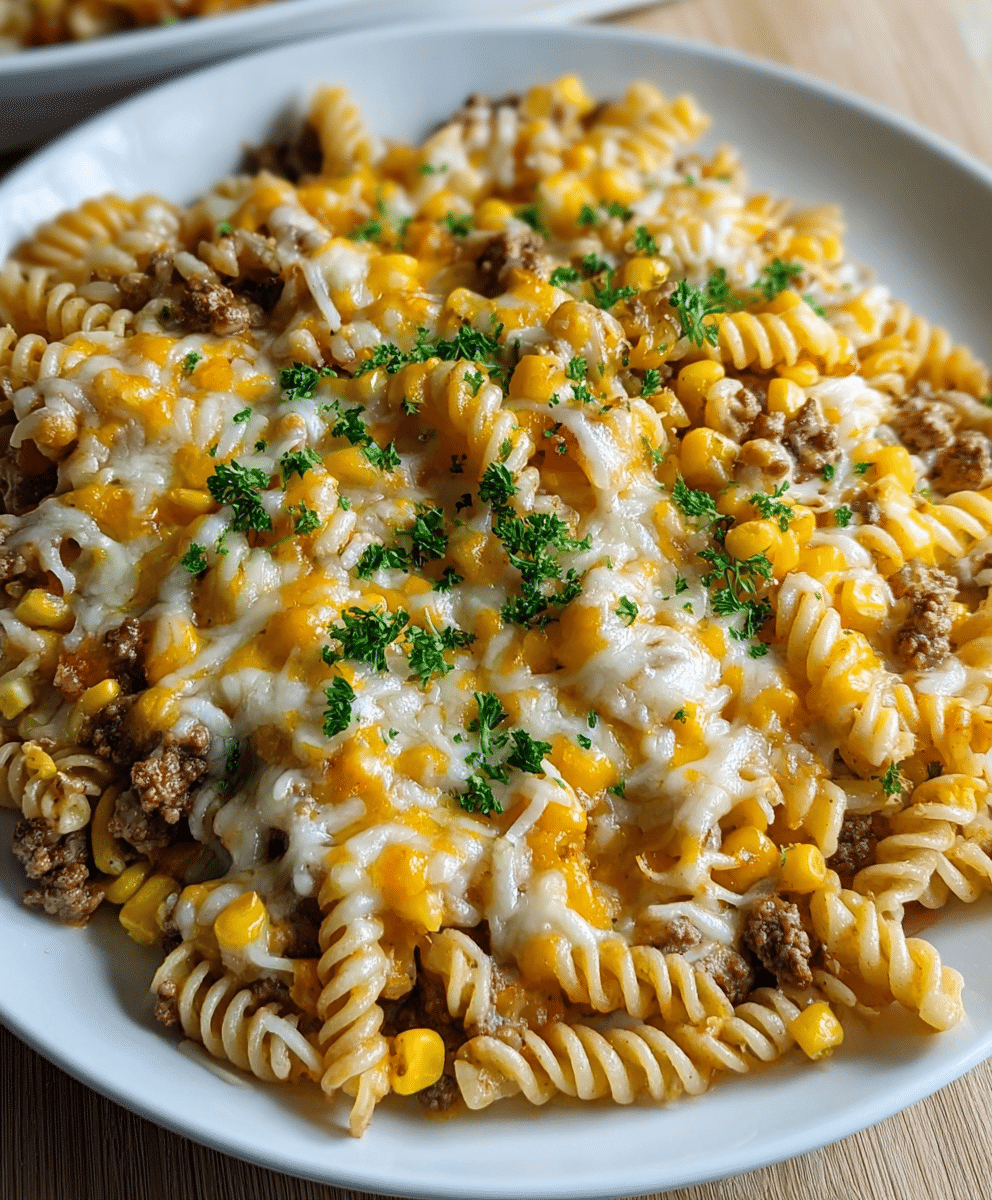 This dish brings together ground beef, rotini pasta, sweet corn, cheddar cheese, and ranch dressing for a flavor-packed, creamy pasta casserole. It’s comforting, cheesy, and filled with all the good stuff that makes everyone go back for seconds.