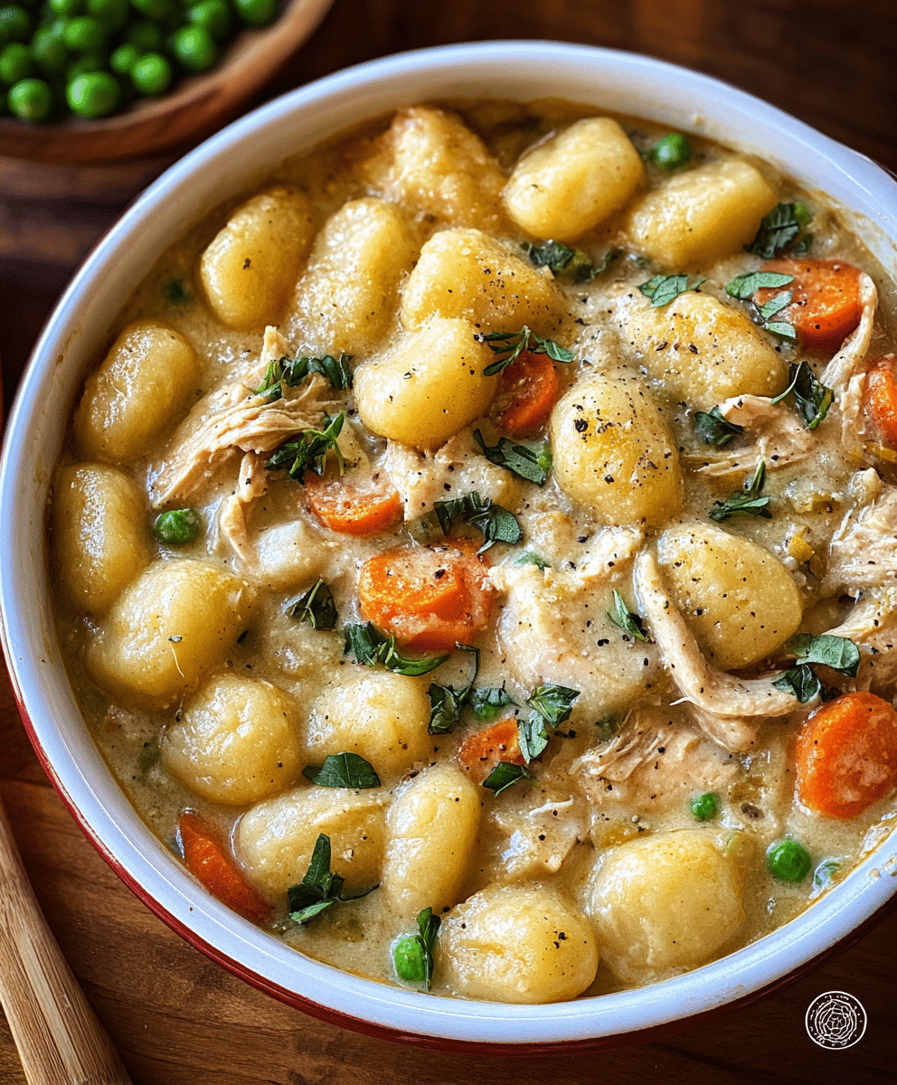 A simple and comforting one-pot gnocchi chicken pot pie featuring tender chicken, fresh gnocchi, and a creamy sauce with vegetables.