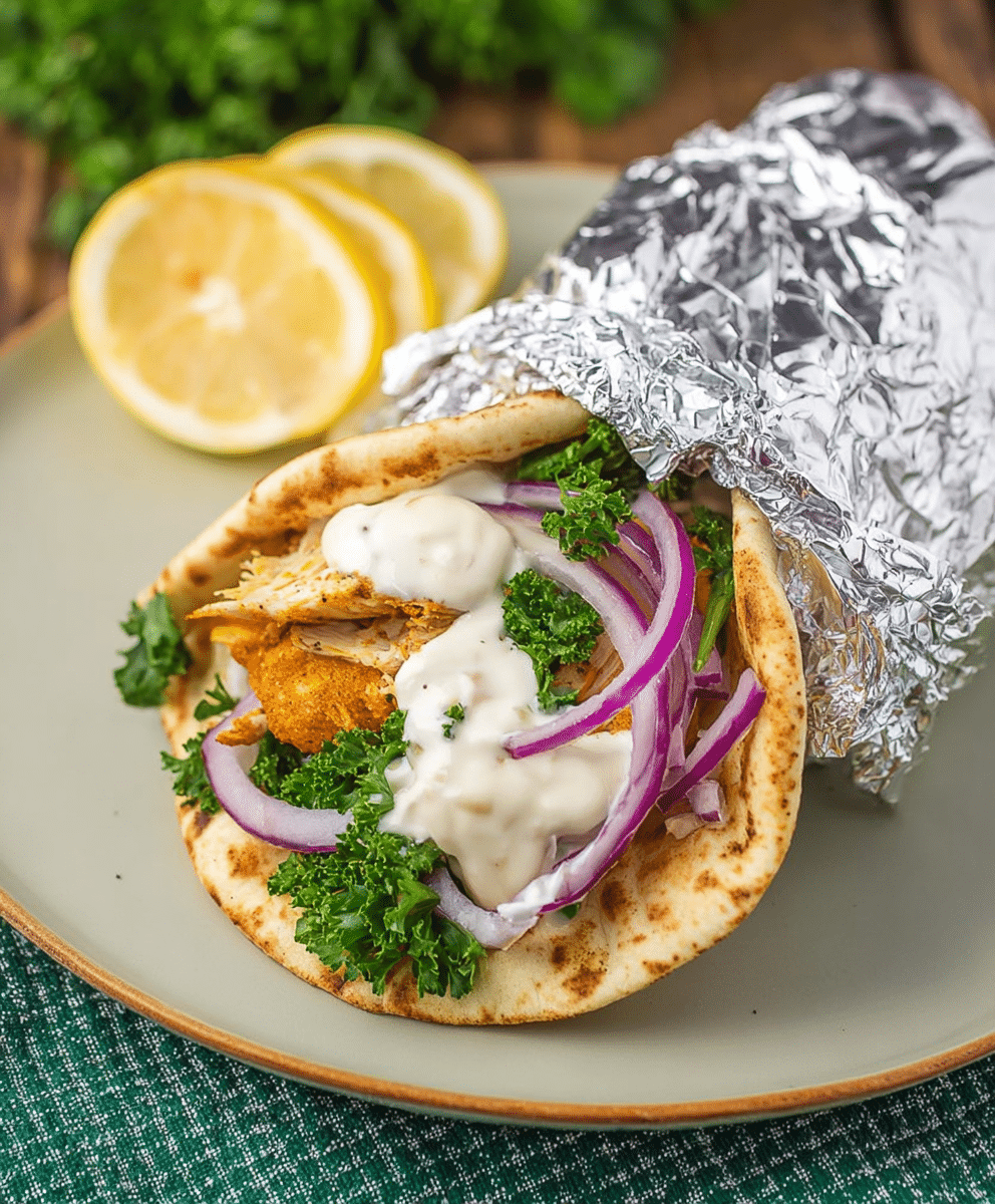 - Warm pitas, fill with chicken, veggies, and yogurt sauce.