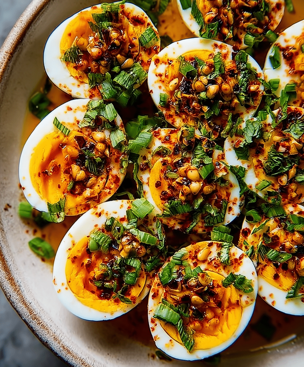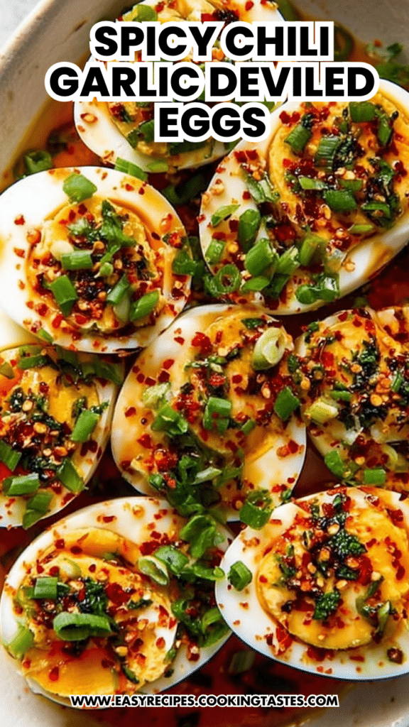 Spicy Chili Garlic Deviled Eggs are a bold twist on a beloved classic. Creamy yolks are blended with tangy Dijon and rich mayo, then topped with a sizzling chili garlic oil that adds crunch, heat, and umami. Perfect for parties or flavor-packed snacks.