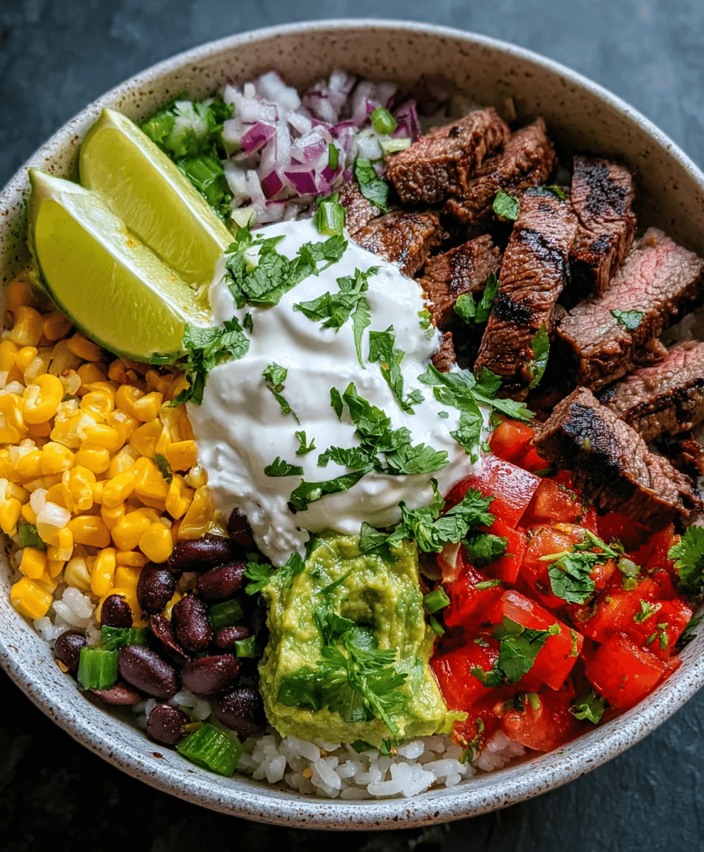 This steak burrito bowl is a vibrant, hearty dish featuring marinated flank steak, fluffy rice, and fresh toppings. Perfect for a quick dinner or lunch that feels a little special.