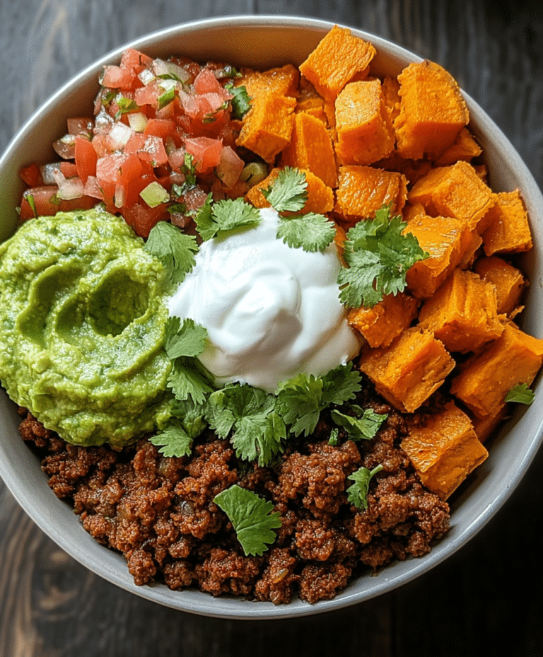 Perfect for weeknight dinners, meal prep, or casual gatherings, this recipe delivers layers of flavor, texture, and color in every bite. The natural sweetness of roasted sweet potatoes pairs beautifully with savory taco-seasoned beef, zesty pico de gallo, and creamy guacamole, making each bowl a celebration of Mexican-inspired comfort food.