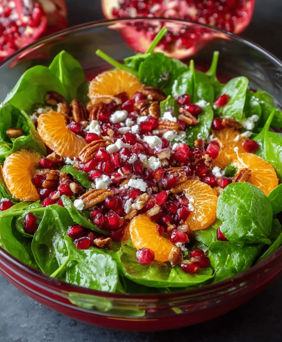 A fresh, colorful Winter Salad with baby spinach, mandarin oranges, pomegranate seeds, feta, and toasted pecans perfect for holiday gatherings.